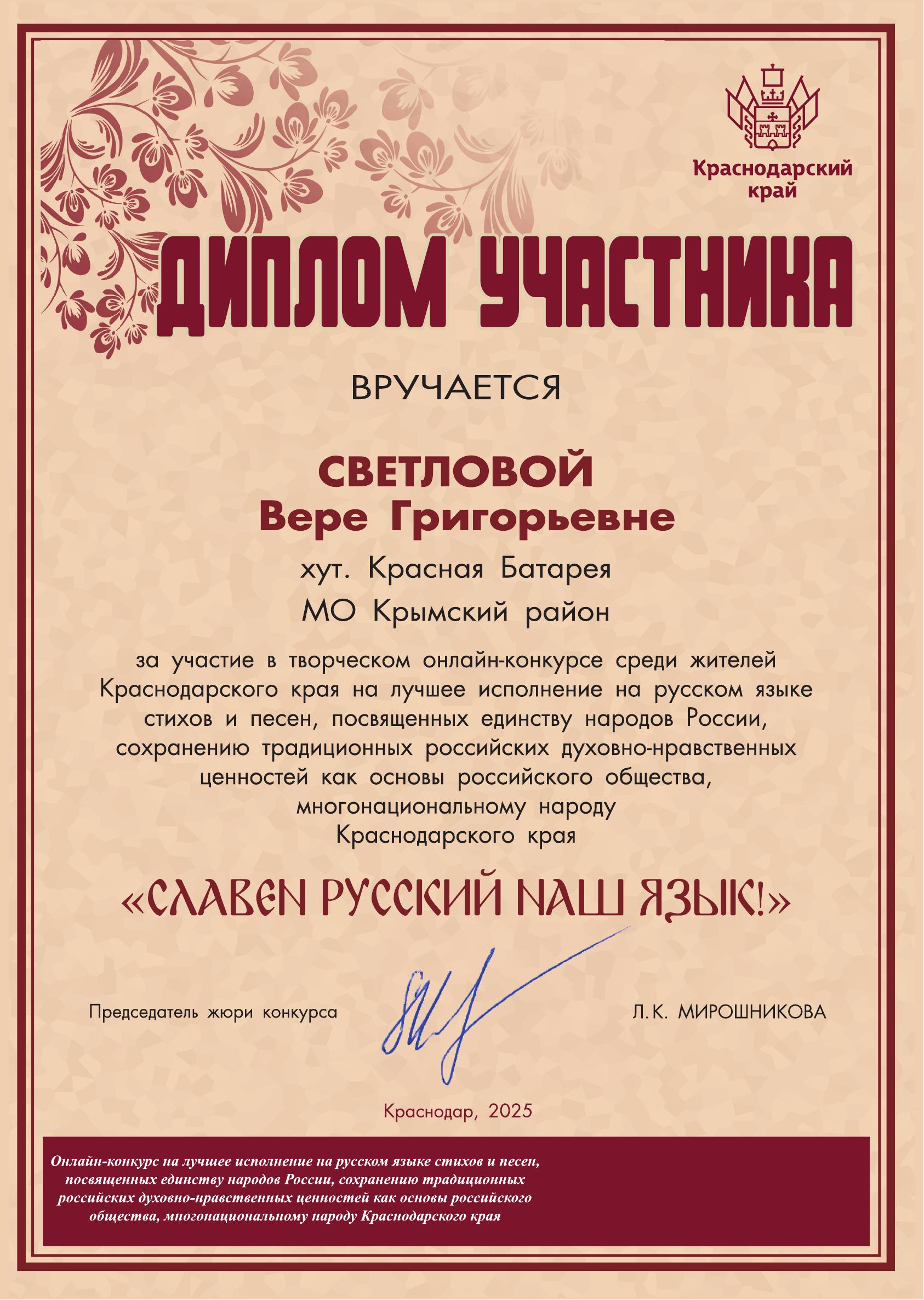 Читатель библиотеки х.Красная Батарея Светлова Вера Григорьевна получила "Диплом участника" за участие в региональном онлайн - конкурсе, направленном на сохранение и развитие русского языка как государственного языка Российской Федерации и средства межнационального общения "Славен русский наш язык".