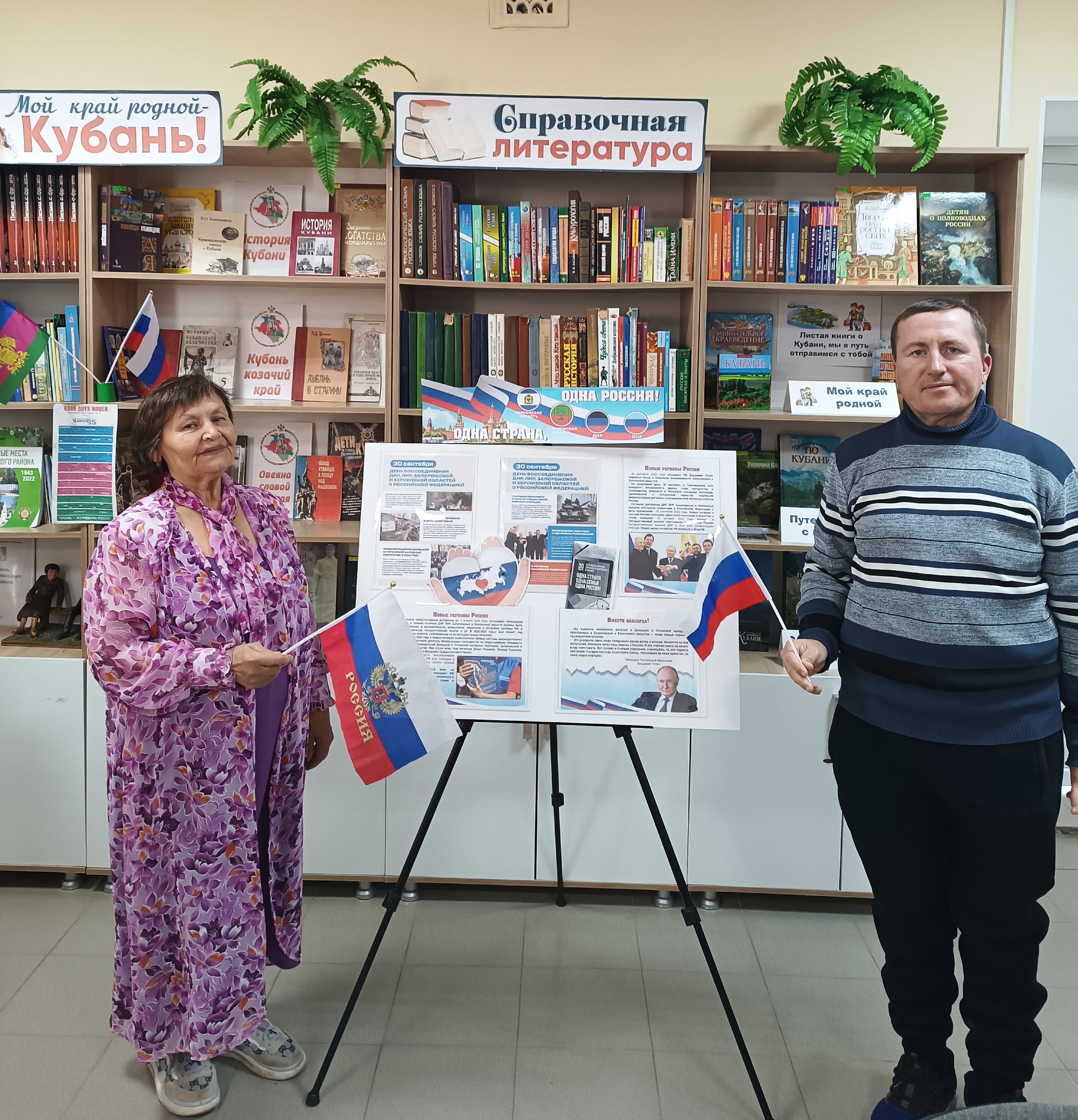 30 сентября в нашей стране отмечается новая памятная дата – День воссоединения Донецкой Народной Республики, Луганской Народной Республики, Запорожской области и Херсонской области с Российской Федерацией. Библиотека х. Красная Батарея к этой дате оформила информационный стенд «Одна страна, одна семья, одна Россия».